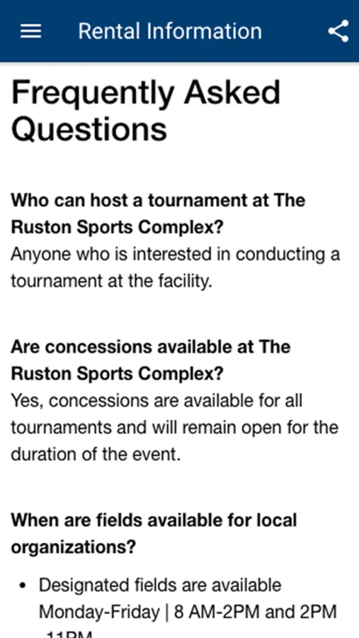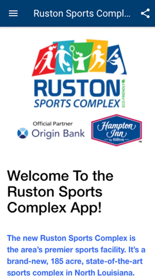 This app was constructed to highlight the elements of the Ruston Sports Complex located in Ruston, Louisiana. This state-of-the-art facility promotes sports team participation as an outlet for healthy exercise for our youth and adults. We partner with our leagues and clubs to collectively provide these opportunities to the public.