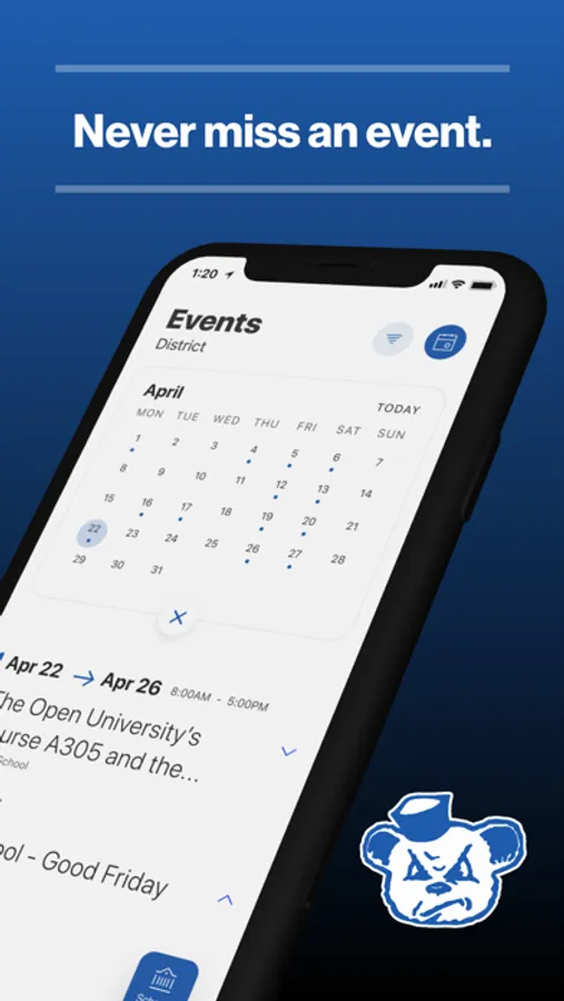 The event section shows a list of events throughout the district. Users can add an event to your calendar to share the event with friends and family with one tap.