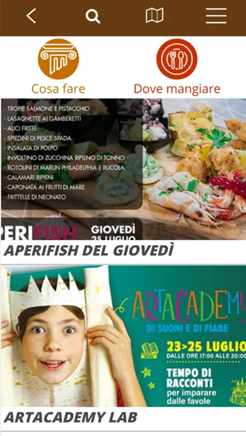 visualizzati dall’utente tramite macrocategorie di interesse (Cosa fare, Cosa mangiare, Dove dormire, Come spostarsi, e la sezione