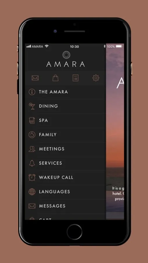 AMARA Hotel — mobile application allowing you to use hotel services in an easy and fast way without having to call or to go the reception. You can order any services or check the latest information about destinations with just one click.