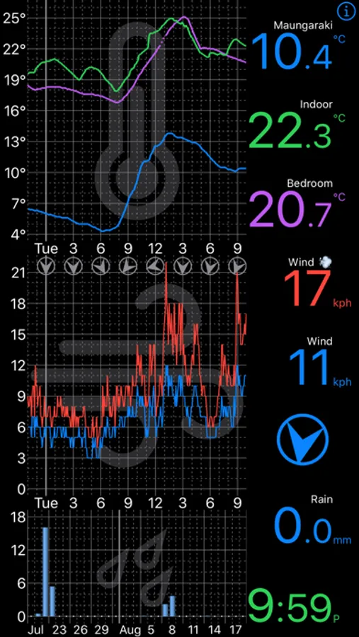 Note - 31 day view graphs a point for every 3 hours. For temperature, humidity and CO2, this is the maximum reading in that 3 hours, for all other readings, it is a sample in the middle of the 3 hours (except rain, which is daily accumulation).