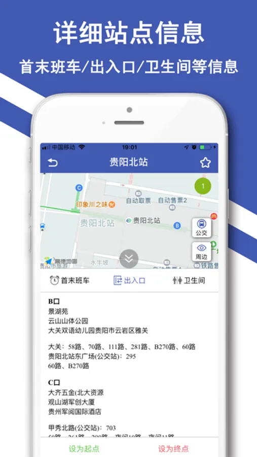 详细站点信息:站点首末班车时间,车站服务设施(卫生间和电梯等)、出入口信息等。