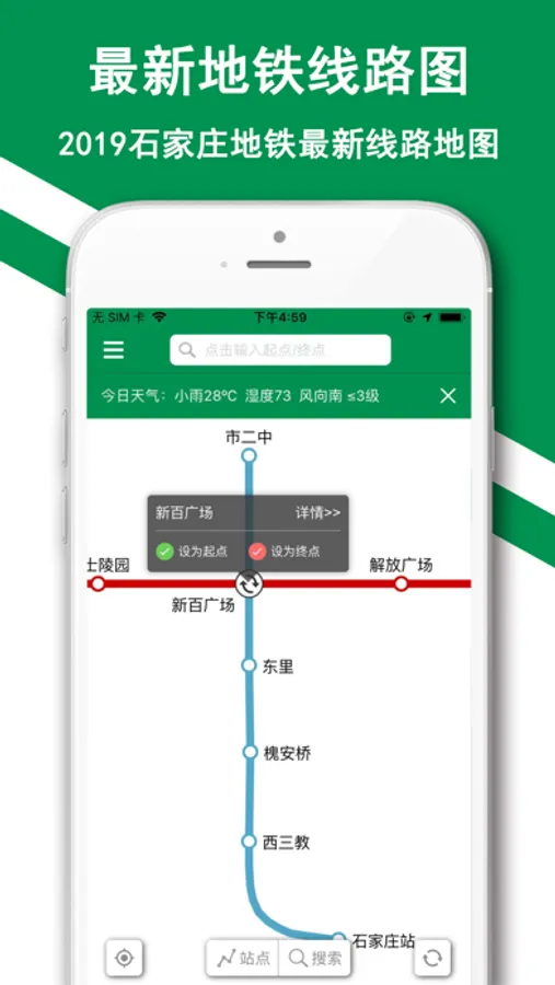 石家庄地铁App,一款专业地铁出行智能助手。拥有2019石家庄最新地铁线路图,查询推荐最优换乘线路,最新站点信息全掌握(含周边)等地铁出行信息和功能。