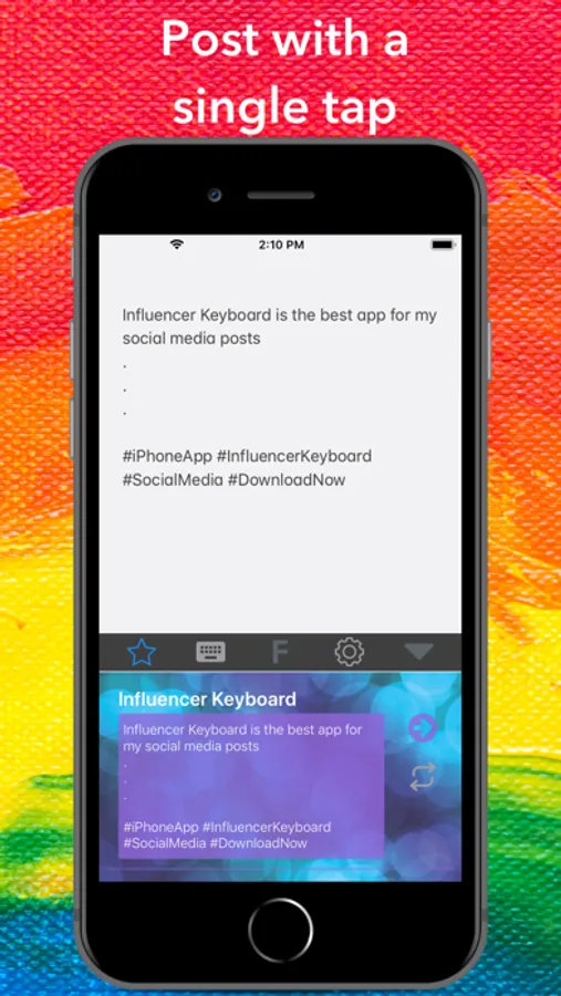 Influencer Keyboard lets you save templates of your frequently used social media text to paste into a post right from your keyboard. No need to switch to a different app, simply switch your keyboard to the Influencer Keyboard and tap the text you would like to post.