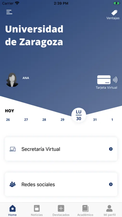 • Perfil privado: Todos tus datos personalizados según tu perfil universitario. Consulta tus asignaturas, calificaciones, etc. Y también tu tarjeta universitaria digital. ¡Siempre la llevarás contigo!