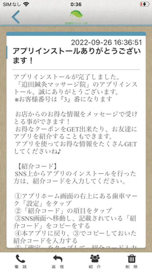 迫田鍼灸院のアプリをSNSを通じてお友達に紹介する事ができます。