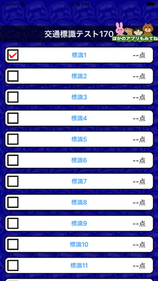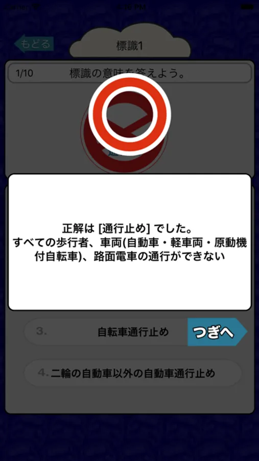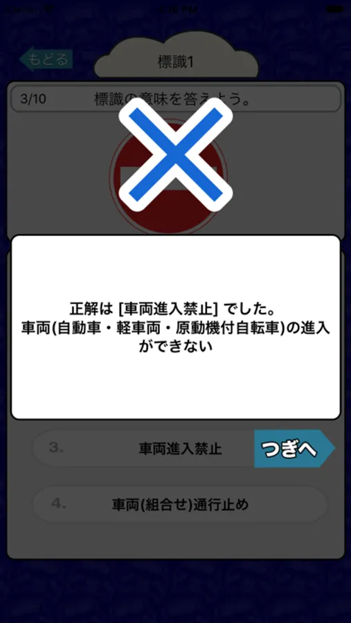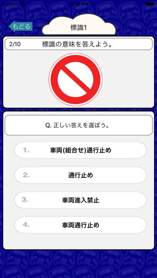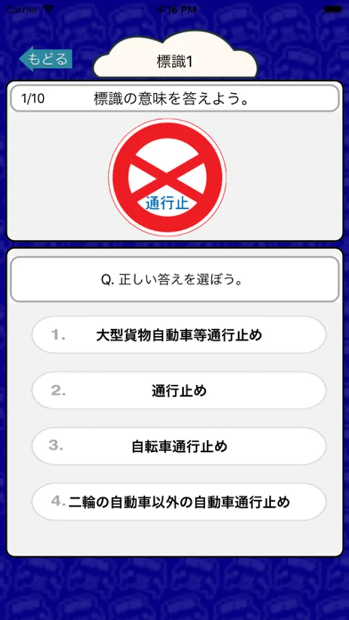 標識の画像を見て何を意味する標識なのかを4択問題で答えるクイズアプリです。