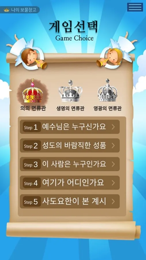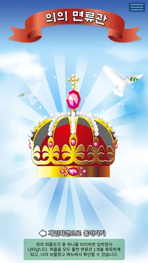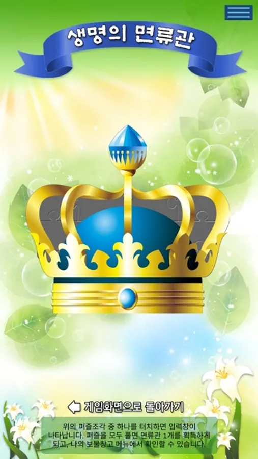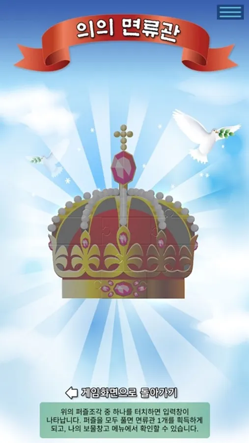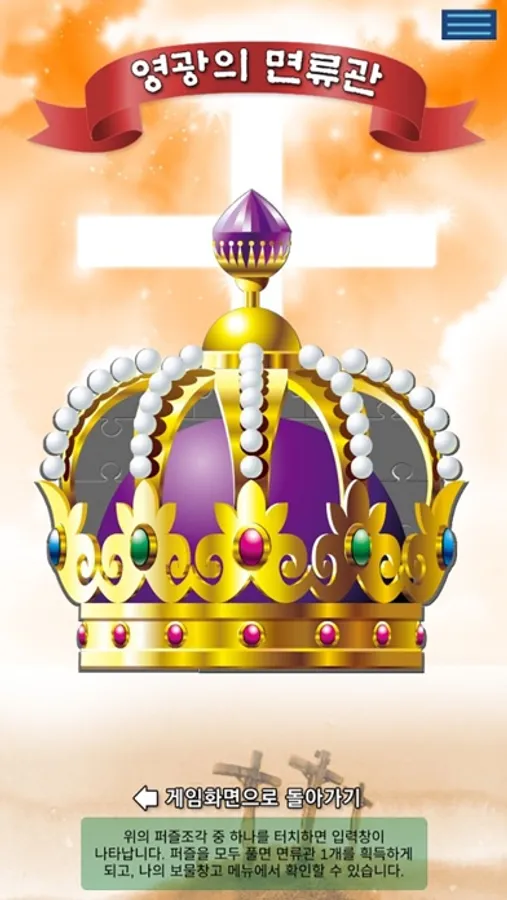 - 면류관을 하나씩 완성할 때마다 나의 보물창고에 면류관이 쌓이게 되고 모든 게임을 마치면 모두 15개의 면류관이 쌓이게 됩니다.