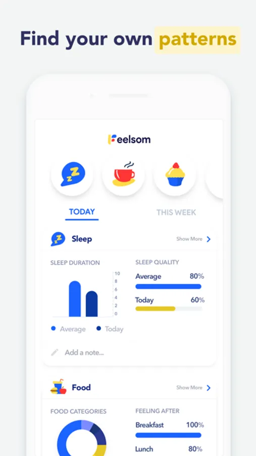 Learn about yourself and find patterns between your daily activities and the way you feel, by tracking health symptoms, food intakes, sleep quality, daily mood, productivity, and physical activity all together!