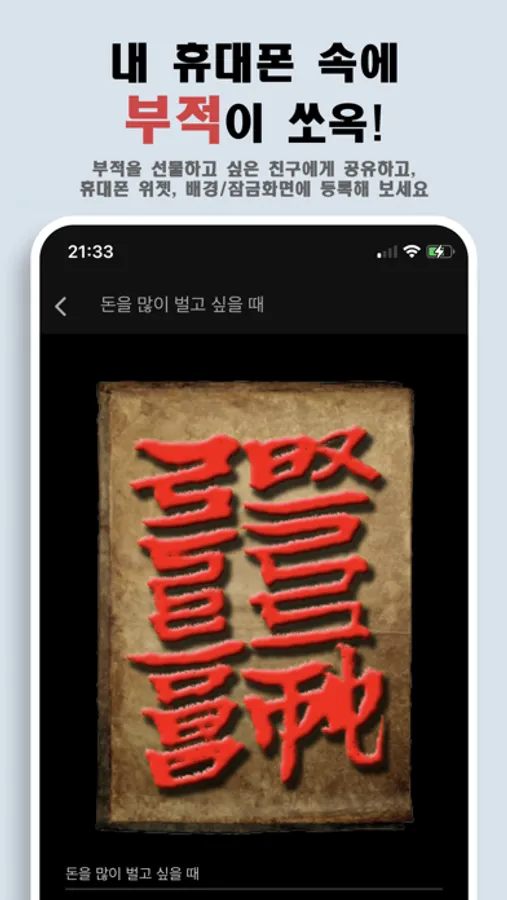 - 부적의 잠금화면 및 배경화면 : 부적을 잠금화면이나 배경화면으로 등록하여 휴대폰을 켤때마다 볼 수 있습니다.