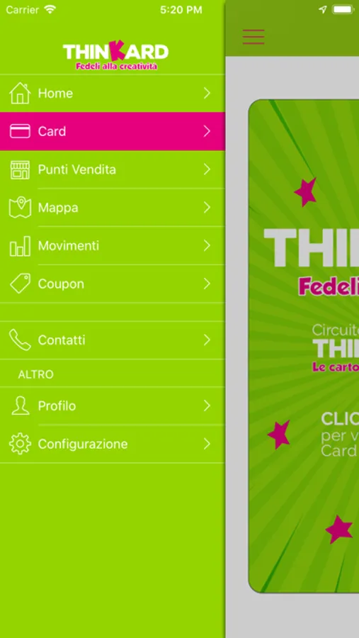 Thinkard è l'app per gestire la tua carta fedeltà thinKreative.Thinkard è gratuita e ti permetterà di risparmiare sui tuoi acquisti, acquisendo giorno dopo giorno un cashback adogni acquisto presso uno dei punti vendita thinKreative, il network delle cartolerie più creative d’Italia! Ogni voltache utilizzerai la tua Thinkard, riceverai una ricarica in euro pari ad una percentuale dell'importo speso, e potraiutilizzare il tuo credito come sconto dal tuo acquisto successivo! In più riceverai, sulla tua app, coupon con scontie prezzi incredibili.ThinKreative riunisce le cartolerie più creative e innovative, dove puoi trovare il migliore assortimento di prodottiper cancelleria a prezzi sempre corretti e convenienti, oltre alla competenza dei cartolai più preparati e sorridenti,sempre pronti a consigliarti al meglio!