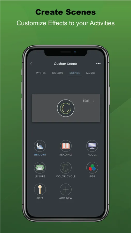 Create Scenes Create unique scenes with customizable effects, color cycles, brightness, and speed.