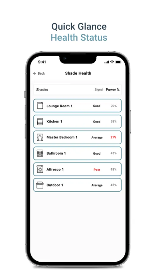 Quickly view the Health Status of all your shades. A summary screen displays the battery levels of all your shades along with signal strength indicators, prompting necessary action to either charge your motors or troubleshoot connections.