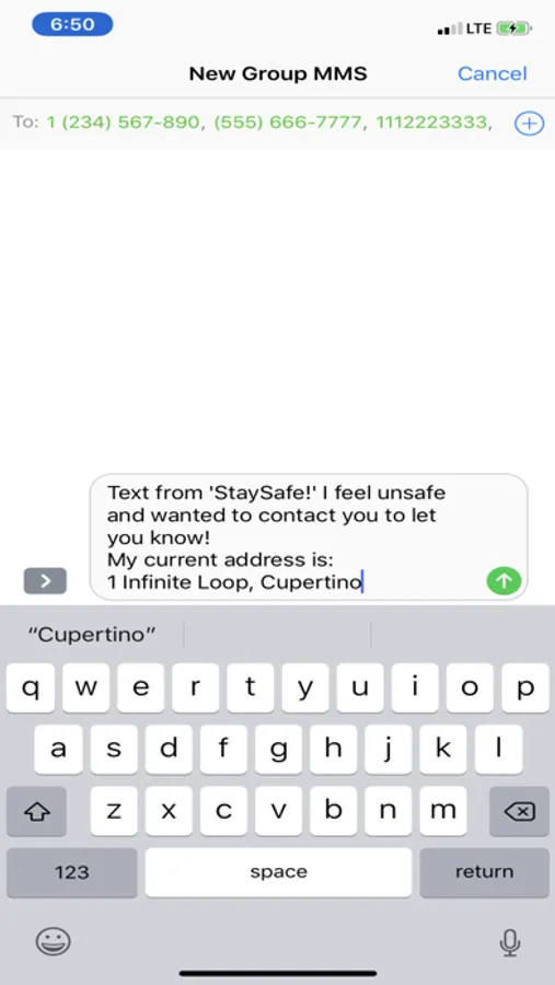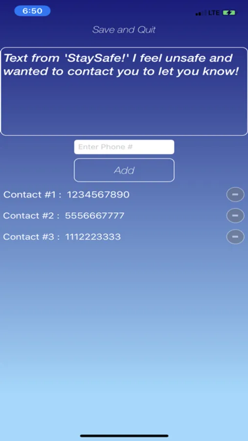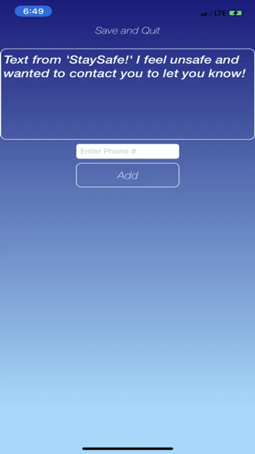 Are you out at night or even in a place you don't feel comfortable at? At the click of a button, 'StaySafe!' instantly takes you to your messages app with a pre-made message for you and lets you send off an alert message to anyone you want in a matter of seconds! Simply save your desired numbers, and whenever and wherever, you'll be able to contact them in at click of a button in a matter of seconds!