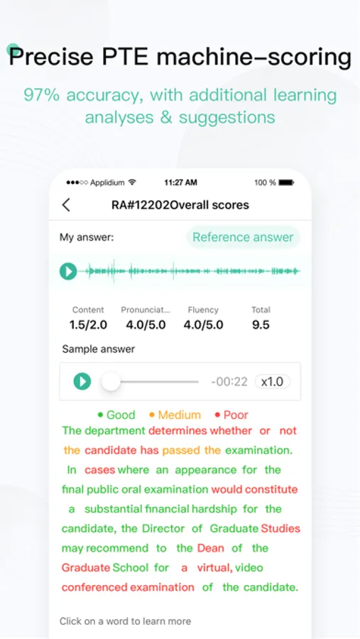 PTEPLUS is an instant-scoring PTE real exam question practice and study APP for PTE Academic exam - with the most extensive updated real exam question bank and third-generation machine-scoring, fully aligned to the official Pearson Academic Score guide, with highest accuracy alignment. In addition to score results, also receive learning analyses & suggestions to improve most quickly and effectively.