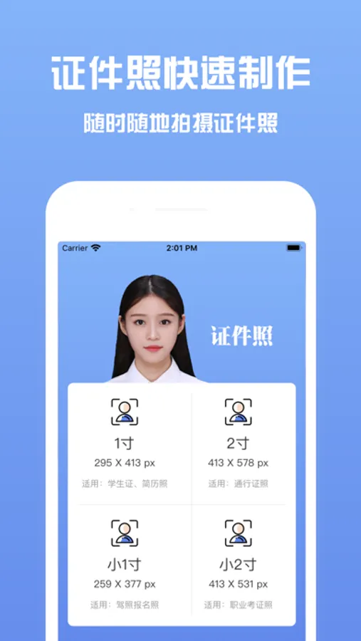 3.支持各种电子证件照尺寸,制作出标准证件照。