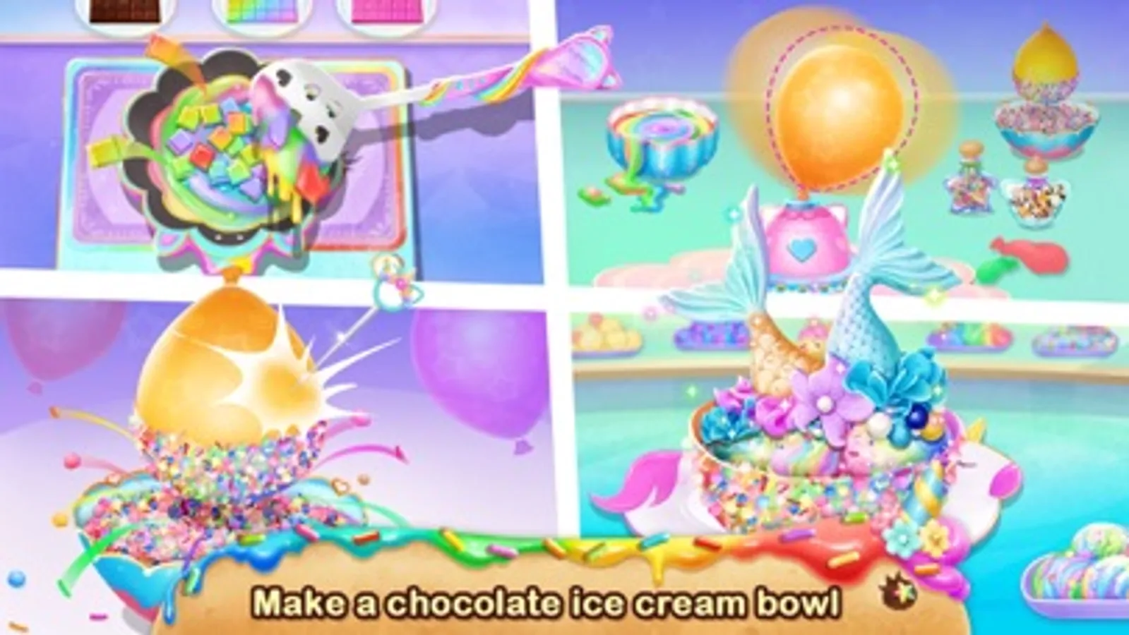 In the restaurant, you'll find many great food like rainbow pizza, mermaid tail cake, chocolate ice cream bowl…