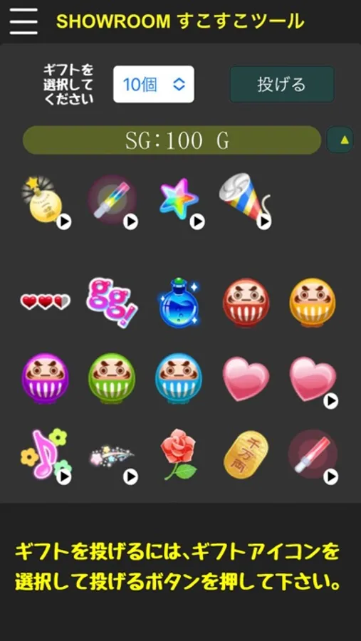 全投げ : 所持している全ての無料ギフト(星か種)を投げます。