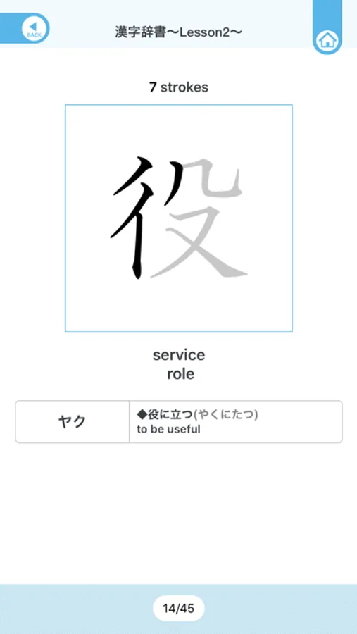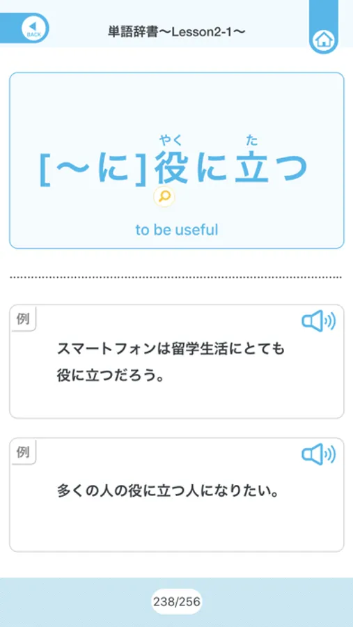 Word Dictionary: You can look up the words that you need to memorize. Each word has two different example sentences; one from the textbook and one that is not from the textbook. You can listen to native pronunciation by tapping on the example sentences. Additionally, tapping on any of the kanji that are introduced in the textbook, you will be brought to that kanji page of the kanji dictionary.