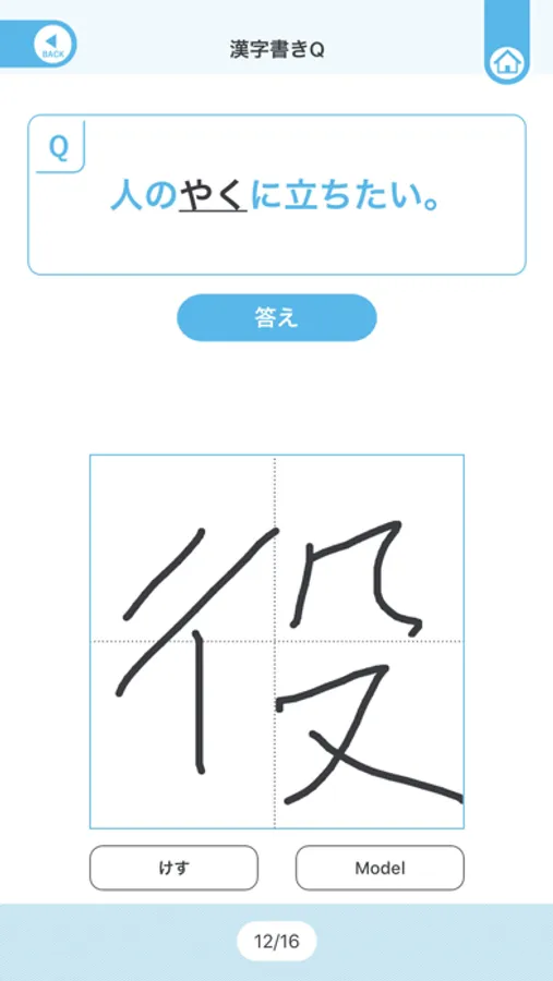 ・漢字書きQ:実際に手で書いて漢字の練習ができます。上手に書きたい人のために、お手本をなぞって書く練習もできます。
