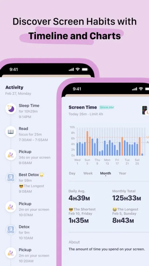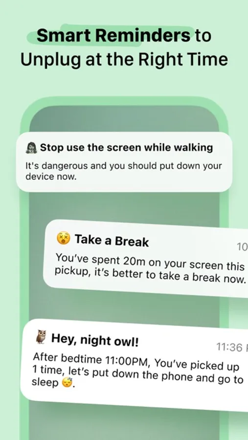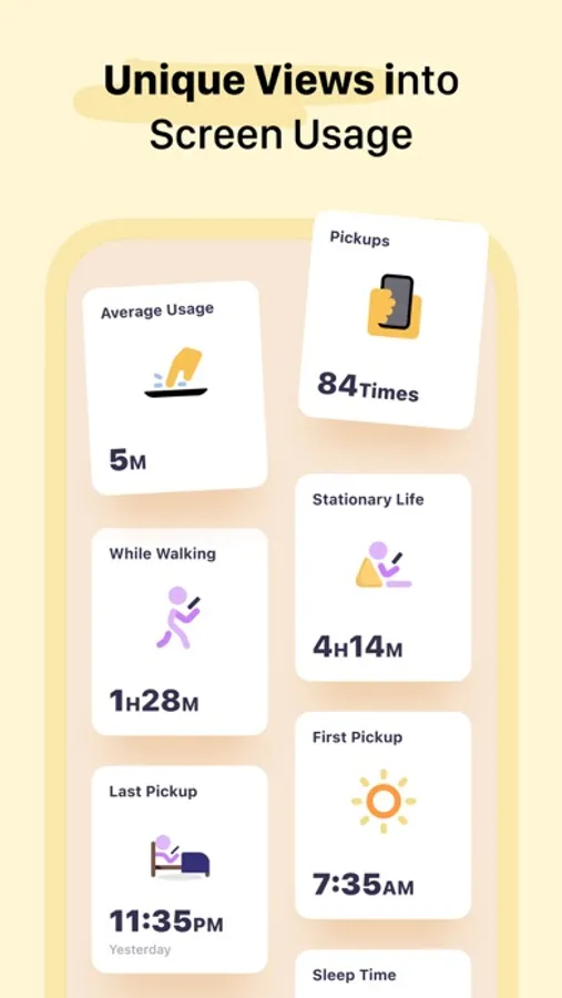 • See screen time activities: Pickups, Average Usage, While Walking, Stationary Life, Last Pickup, First Pickup, Best Break, and Sleep Time