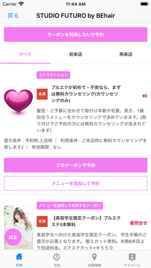 お得なクーポンが配信されます。ネット予約時にクーポン利用での予約も可能なので来店時もスムーズに施術頂けます。