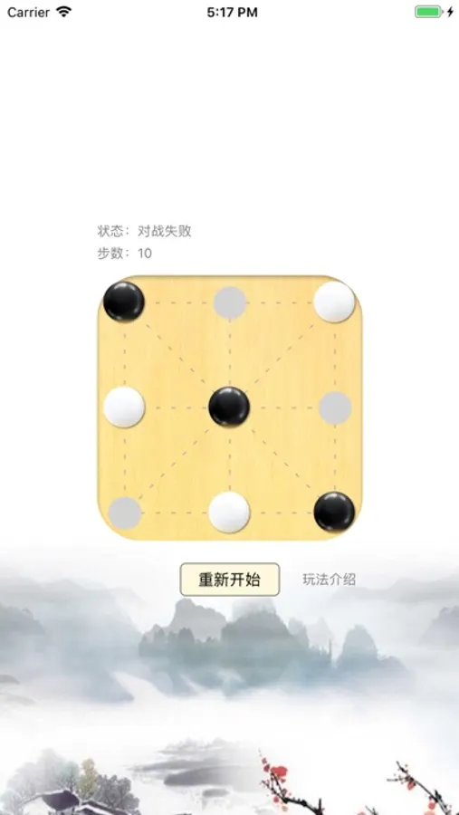 3.胜负判定: 当一方先将己方3枚棋子形成对角线或者将对方棋子逼得无路可走时,则己方取得胜利。