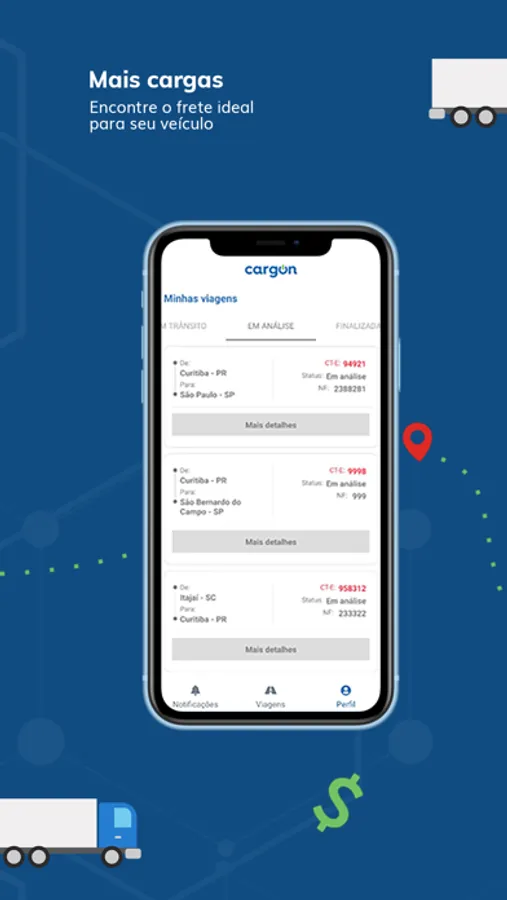 Procurando um aplicativo de fretes para encontrar cargas com facilidade na sua região e que tenha frete pra caminhoneiro? Então o CargOn é perfeito para você, caminhoneiro! Sabendo que a vantagem de fazer frete é aumentar a renda e valorizar seu trabalho, o aplicativo tem uma página dedicada apenas para ofertas de transporte de cargas, com fretes já calculados ou a combinar para que você e seu caminhão façam entregas sem se preocupar!