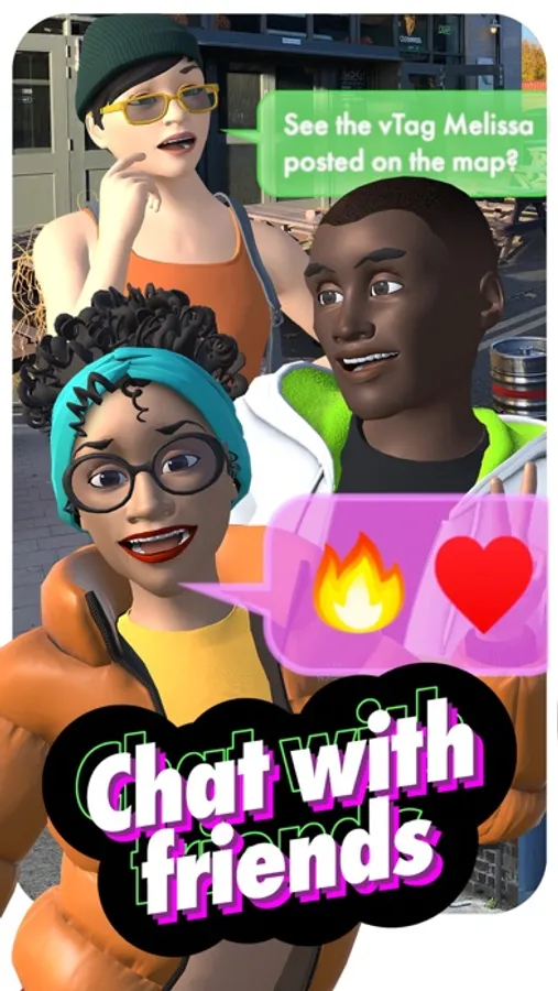 Use vTag’s AR camera to bring your vMe into the real world! DM your vTags to friends in full 3D or tag messages to real-world locations for them to discover later.