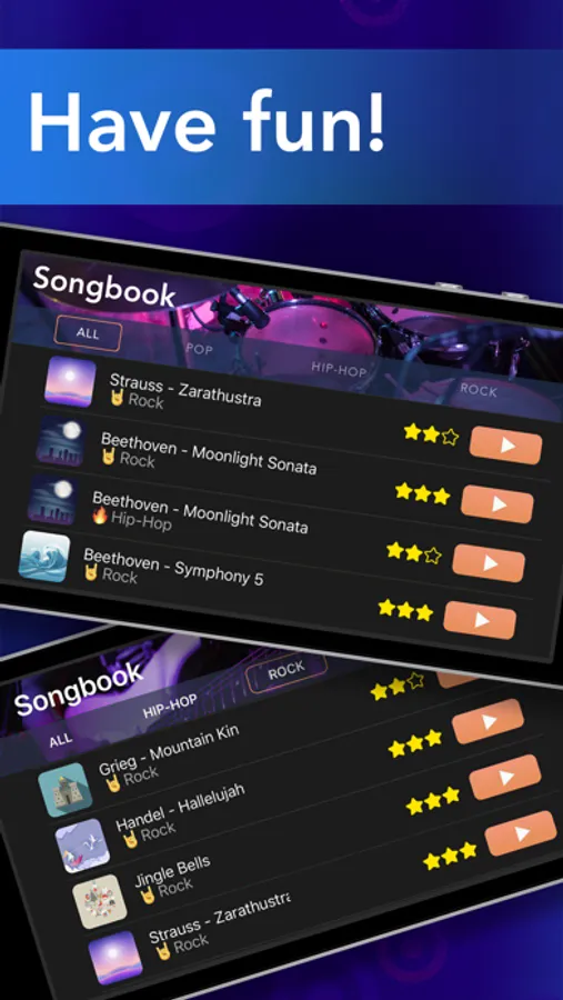 Get drums into your pocket! Play world-famous hits in various music genres - Rock, Pop, Hip-Hop, Dance. No experience needed!