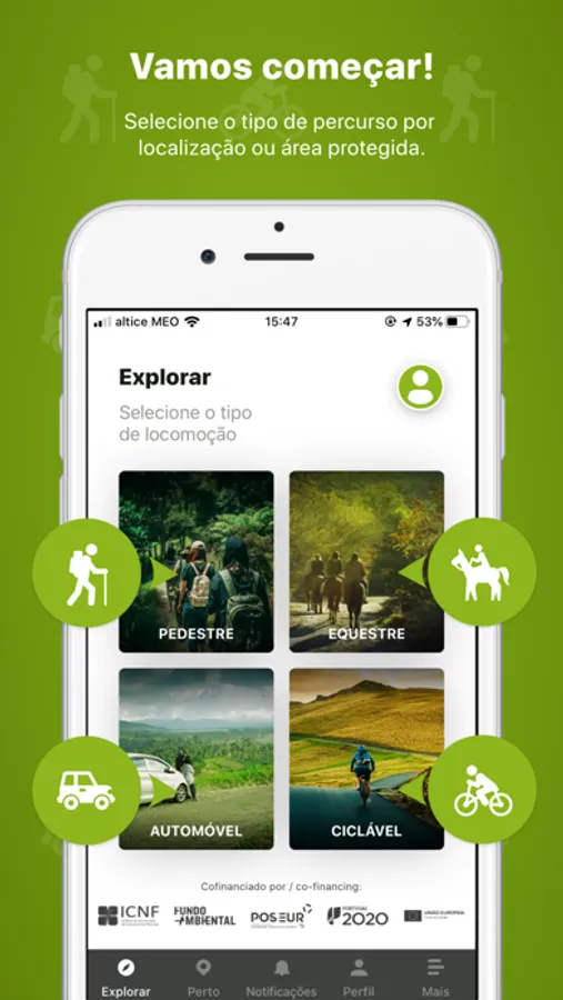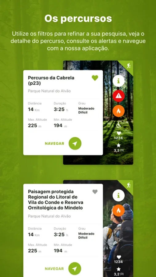Make known the values present in the National Network of Protected Areas of the Portuguese continent, spreading the pedestrian, cycling, equestrian and car routes, providing a set of tools that allow you to select by type of route, location or protected area, refine your search, get alerts directly from the Portuguese Institute of Sea and Atmosphere, evaluate routes, get to know the products and services of the Natural.PT brand, promoted by ICNF, IP, get your route to view offline, earn points for each route traveled.