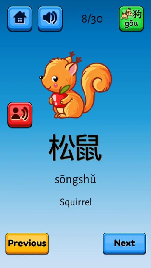 Fun Chinese Flashcards contains words from 50 categories, such as sports, wildlife, fruit, vegetables, food, drinks, Chinese food, shapes, dinosaurs, aquatic animals, domestic animals, small creatures, birds, nature, buildings, home, kitchen, bathroom, school, rooms, transportation, clothing, toys, space, technology, body, tools, nuts and seeds, sweets, music, professions, weather, China, colors, emotions, days and months, family, positions, actions, adjectives, countries, flags, and numbers.