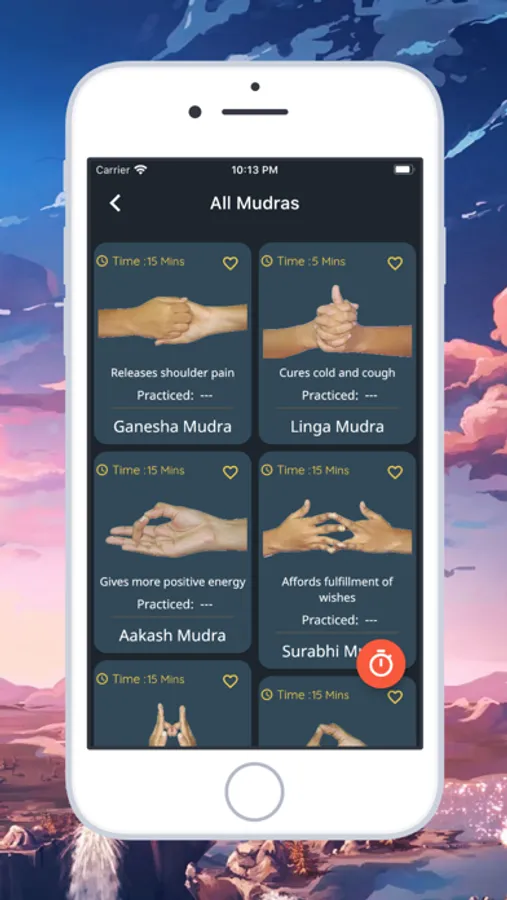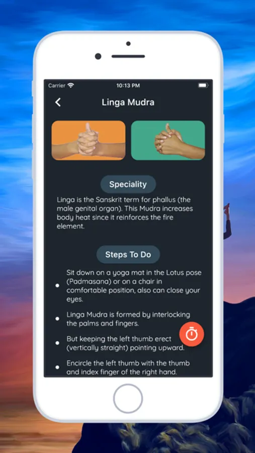 • In this Yoga Mudras application, you can access more than 50 important Yoga Mudras, their benefits, specialties, steps to do descriptions, beneficial body parts etc.,