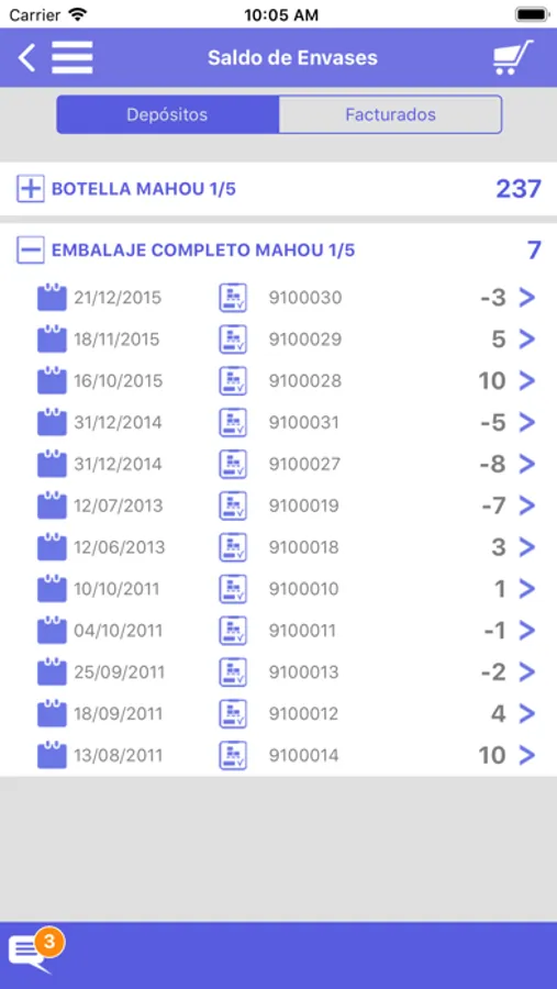 * Histórico de envases y embalajes con diferenciación de facturados y en depósito.