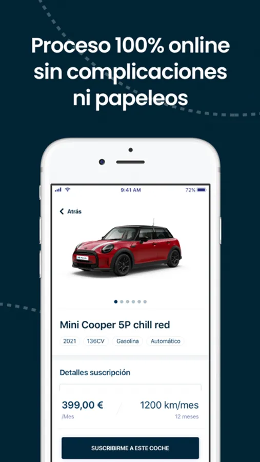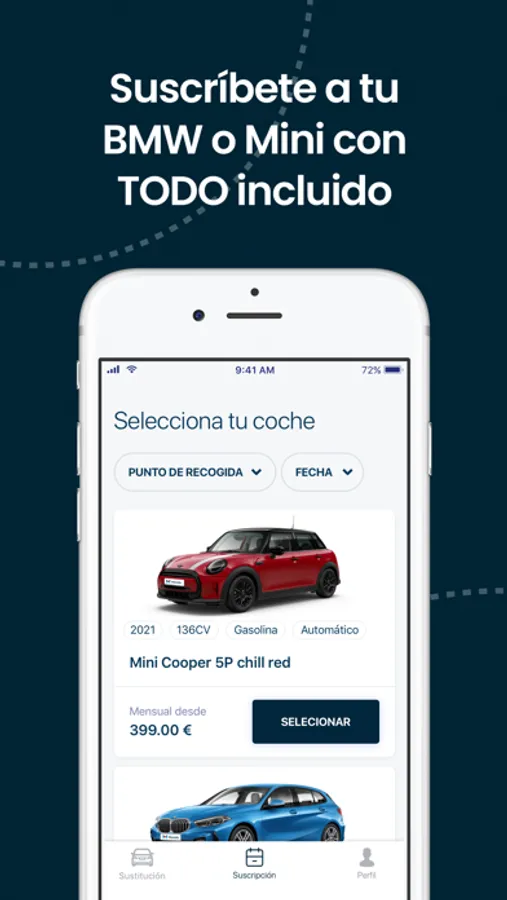 Elige el BMW o MINI que quieras, duración y kilometraje que mejor se adapte a ti y olvídate de gastos inesperados. Tu suscripción incluye seguro a todo riesgo, asistencia en carretera, averías y mantenimiento. ¡El coche que escojas será el que te lleves!