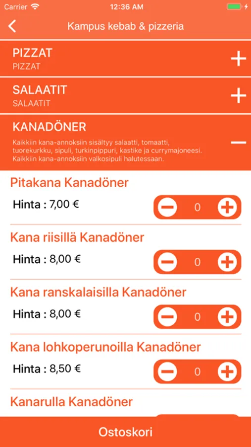 Tilaa pizzat ja kebabit noutona tai kotiinkuljetettuna. Tarjontaamme kuuluvat pizzat, kebabit, KANADÖNER, KEBABANNOKSET, RULLAKEBABIT, SPECIALIT, KEBAB & KANADÖNER BOX, FALAFELIT ja SALAATIT.