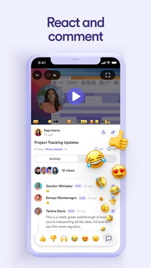 Using Loom, you can collaborate with your team, add time-stamped comments and reactions to those videos, and save videos you’ve recorded to your device. Now, you can spend less time crafting the perfect email in-between meetings, and say it with video using Loom for iOS.