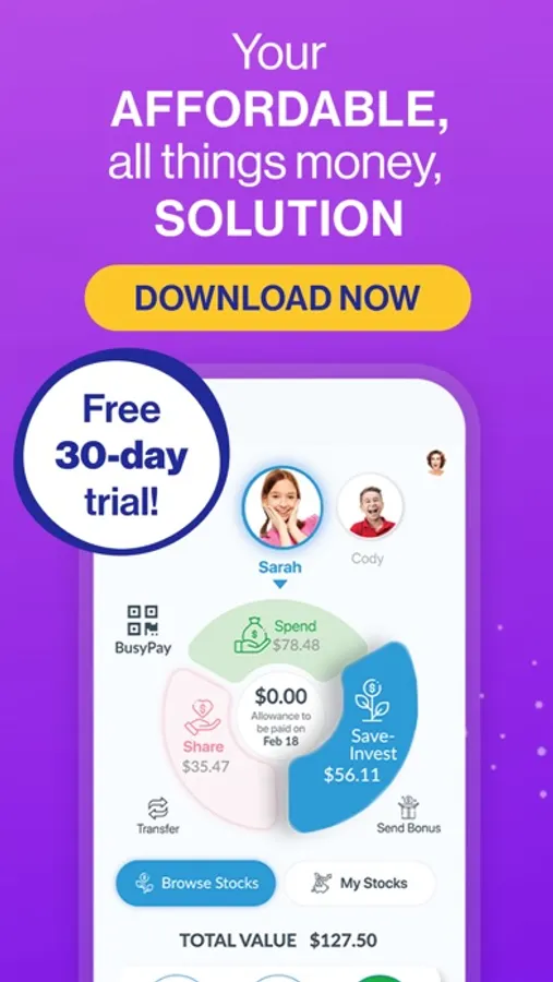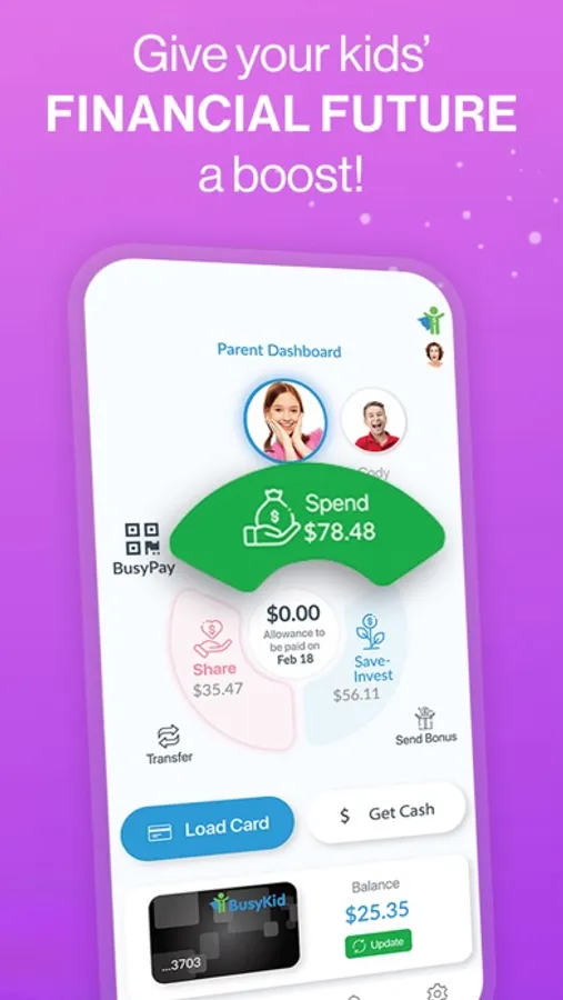 Get more bang for your buck! One affordable app that teaches your kids the value of money, how to handle it, spend it wisely, donate it, and even learn how to invest it. Manage chores and allowance, get our Debit Cards and learn how to handle money together, as a family. Feel like trying our app already? Well, here’s what joining the BusyKid family will give you and your kids: