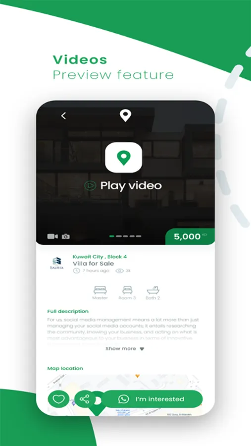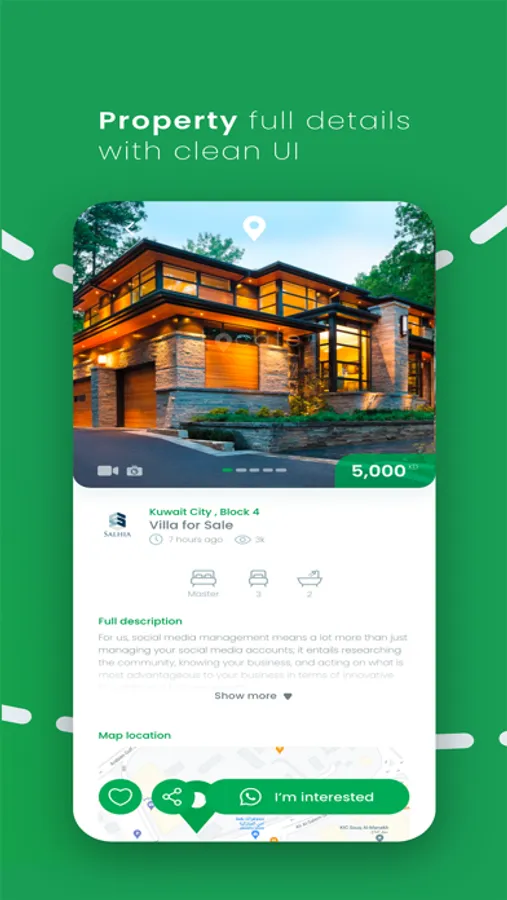 يمكّنك التطبيق من عرض صور الممتلكات ومقاطع الفيديو والموقع وحتى الحصول على نظرة عامة كاملة على وسائل الراحة المتاحة.