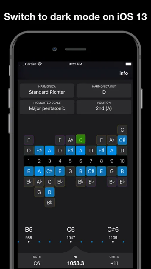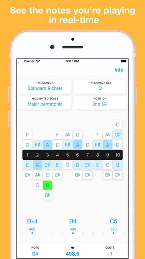 Blue Harmonica is a Harmonica Tuner app. It allows you to see in real time what notes you're playing.