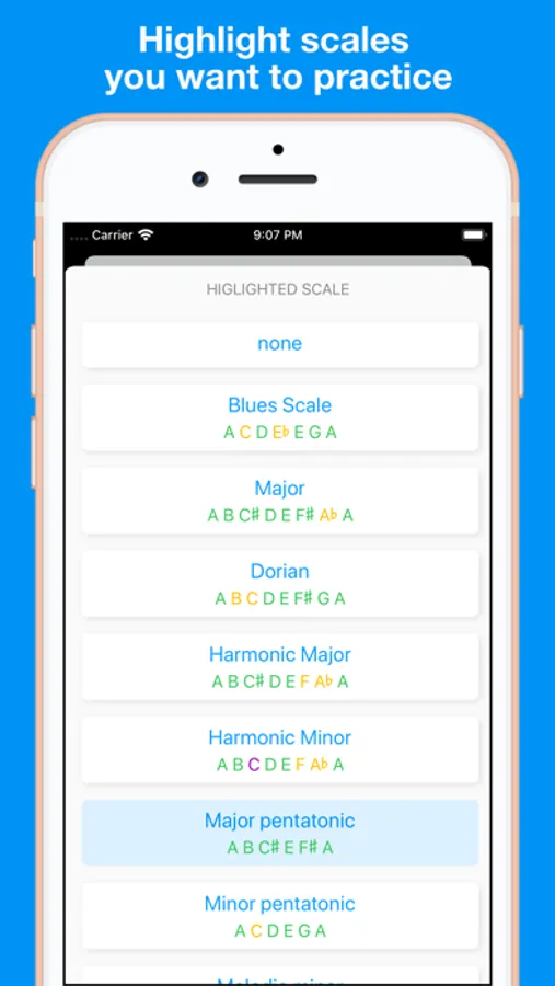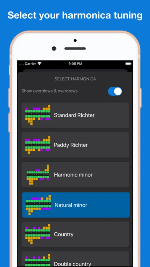 Blue harmonica supports following harmonica tunings in any key from low G to high F#:
