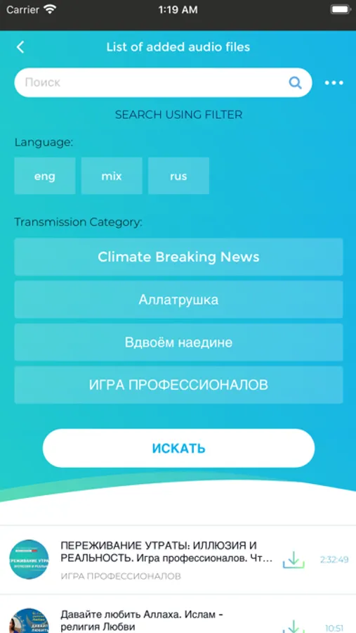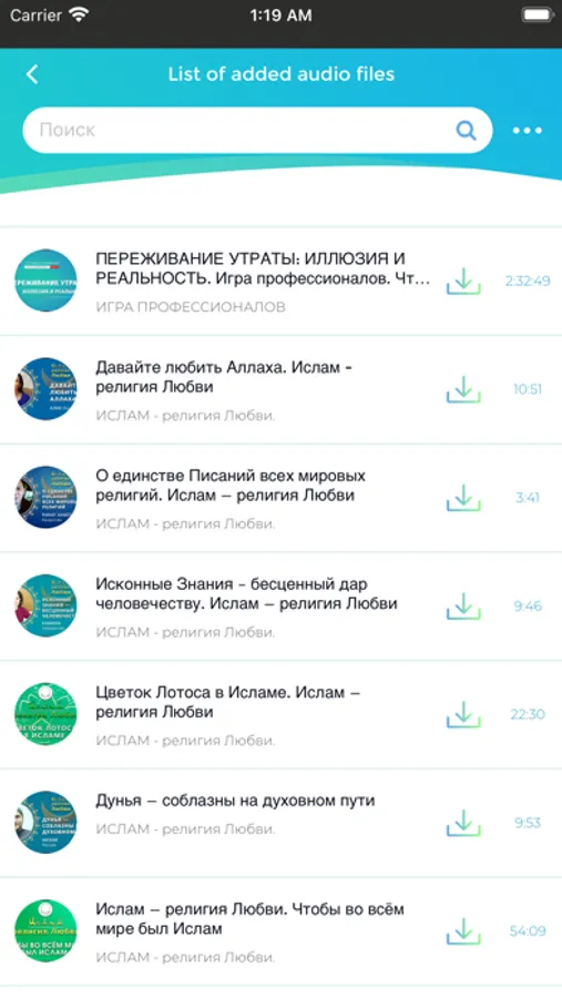 AllatRa AudioLibrary allows user to download any content from various YouTube AllatRa TV channels and convert it to audio track and store on the users phone. At the moment АллатРа ТВ or AllatRa TV English are supported. All downloaded content is stored in mp4/wav format (choose). They are avaialable to play and listen later while having no access to the Internet. Application remembers position in time of each played audio file/track. This is very convenient as user can continue listening from where he stopped. Application allows user to search by key phrases, allows to set filters and search in different languages. User can listen to selected downloaded audio file at the background - saves battery life. While listening to the audio file a quick access menu is provided so user can quickly navigate through.