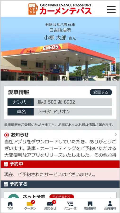 当社のアプリ「八雲石油公式アプリ」ではアプリで簡単に洗車・コーティングなどのご予約や愛車のメンテナンス管理が可能の他、ご登録いただいた店舗で利用いただけるお得なクーポンや各種メニューの割引情報を配信しております。