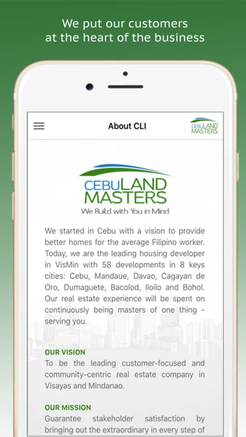 CLI Masters Portal is the innovative mobile application of Cebu Landmasters, Inc, to provide its buyers, sellers, and homeowners with relevant company information and the latest offerings.