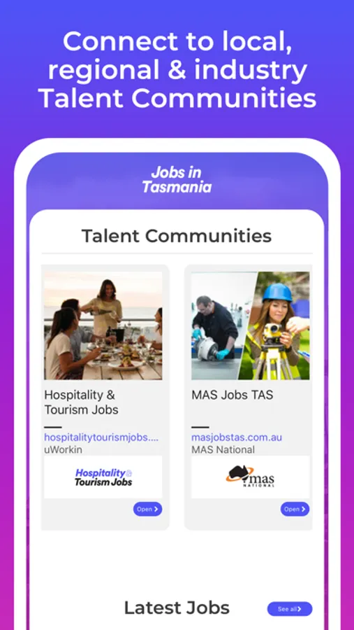 The Jobs in Tasmania App connects you to local, regional, project and industry based Talent Communities so you can access exclusive employment opportunities from employers. Talent Communities also connect you to work, education, events, support and information for employment options and career pathways of interest.