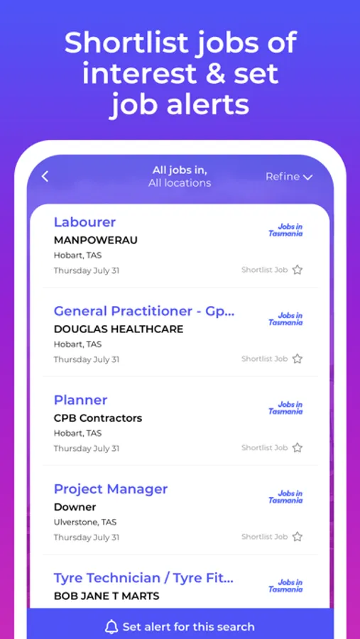 The Jobs in Tasmania App provides you access to thousands of jobs, work experience, traineeships, internships, apprenticeships and career vacancies from company websites and job boards across Tasmania.