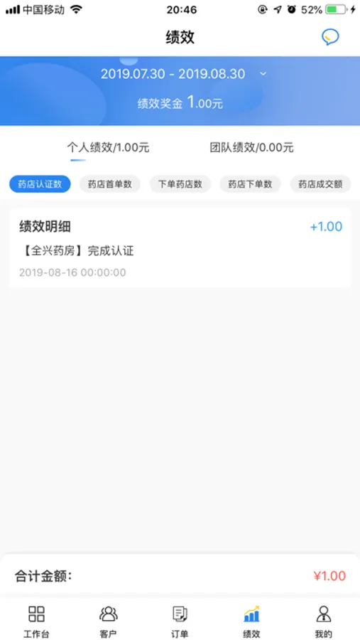 绩效:整合客户下单数据,自动核算绩效,核算明细可查看。