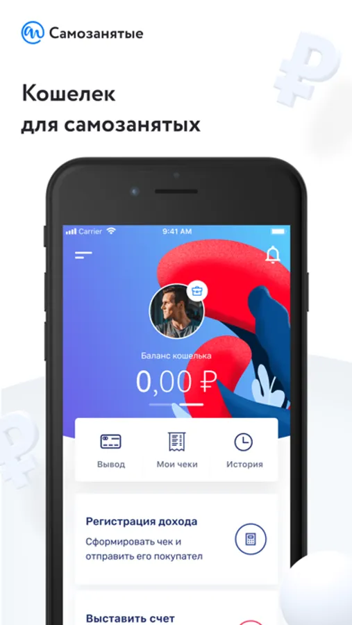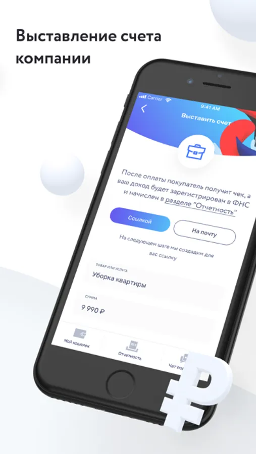 Формирование счета с реквизитами кошелька и наименованием услуги - прямо в приложении. После оплаты покупатель автоматически получит чек.