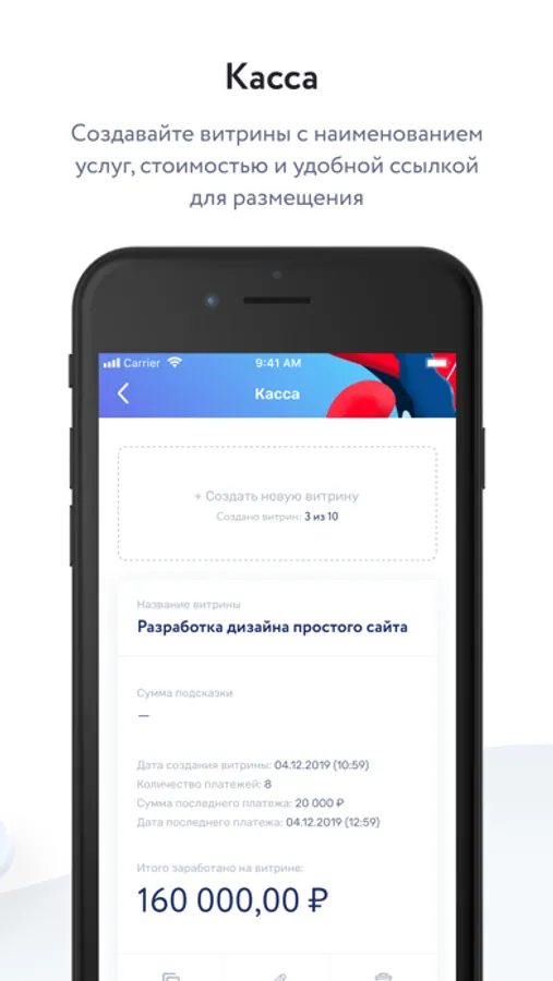 Возможность создания витрины с наименованием услуг и прайсом. Разместите ссылку на сайте, в соцсетях, или распечатайте красивый QR-код - на ваш вкус. Вы получаете оплату в один клик через ApplePay/GooglePay, а клиенты - чеки.