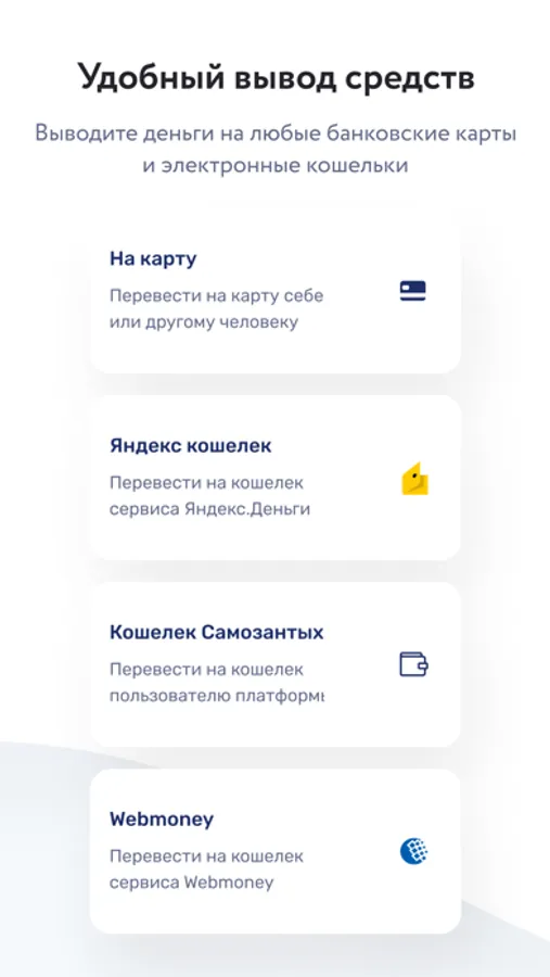 Вывод денег на любые банковские карты или электронные кошельки. Записи об операциях бережно хранятся в истории вашего личного кабинета.